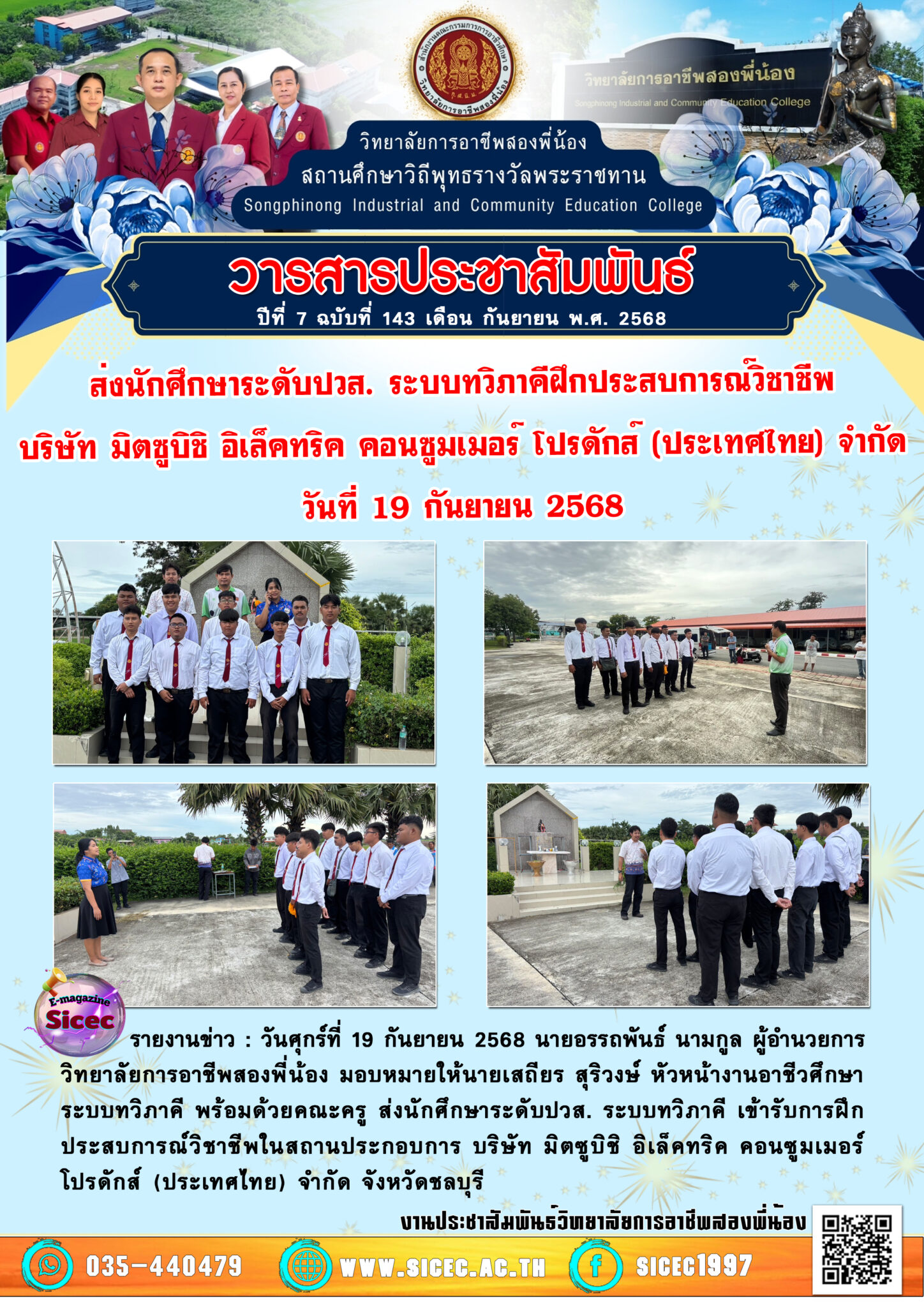 ฉบับที่ 143 ส่งนักศึกษาระดับปวส. ระบบทวิภาคีฝึกประสบการณ์วิชาชีพบริษัท มิตซูบิชิ อิเล็คทริค คอนซูมเมอร์ โปรดักส์ (ประเทศไทย) จำกัด 19 กันยายน 256819 กันยายน 2025 นายอนุสรณ์ วงษ์ประเสริฐ จดหมายข่าว นายอนุสรณ์ วงษ์ประเสริฐ