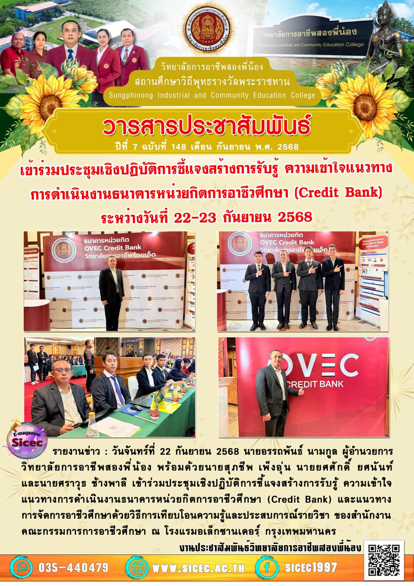 ฉบับที่ 148 เข้าร่วมประชุมเชิงปฏิบัติการชี้แจงสร้างการรับรู้ ความเข้าใจแนวทางการดำเนินงานธนาคารหน่วยกิตการอาชีวศึกษา (Credit Bank) 22 กันยายน 2568 นายอนุสรณ์ วงษ์ประเสริฐ จดหมายข่าว นายอนุสรณ์ วงษ์ประเสริฐ