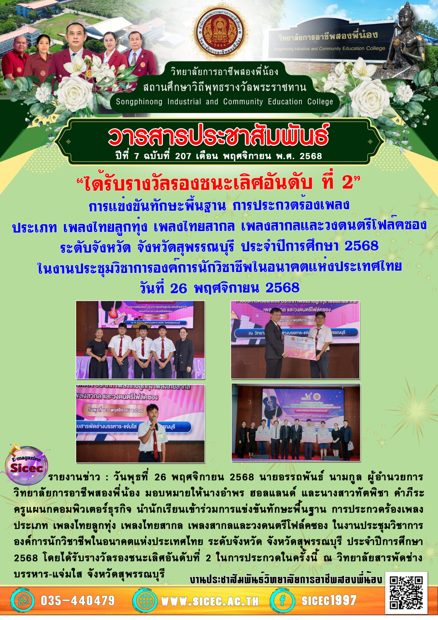 ฉบับที่ 207 “ได้รับรางวัลรองชนะเลิศอันดับ ที่ 2”การแข่งขันทักษะพื้นฐาน การประกวดร้องเพลงประเภท เพลงไทยลูกทุ่ง เพลงไทยสากล เพลงสากลและวงดนตรีโฟล์คซองระดับจังหวัด จังหวัดสุพรรณบุรี ประจำปีการศึกษา 2568ในงานประชุมวิชาการองค์การนักวิชาชีพในอนาคตแห่งประเทศไทย