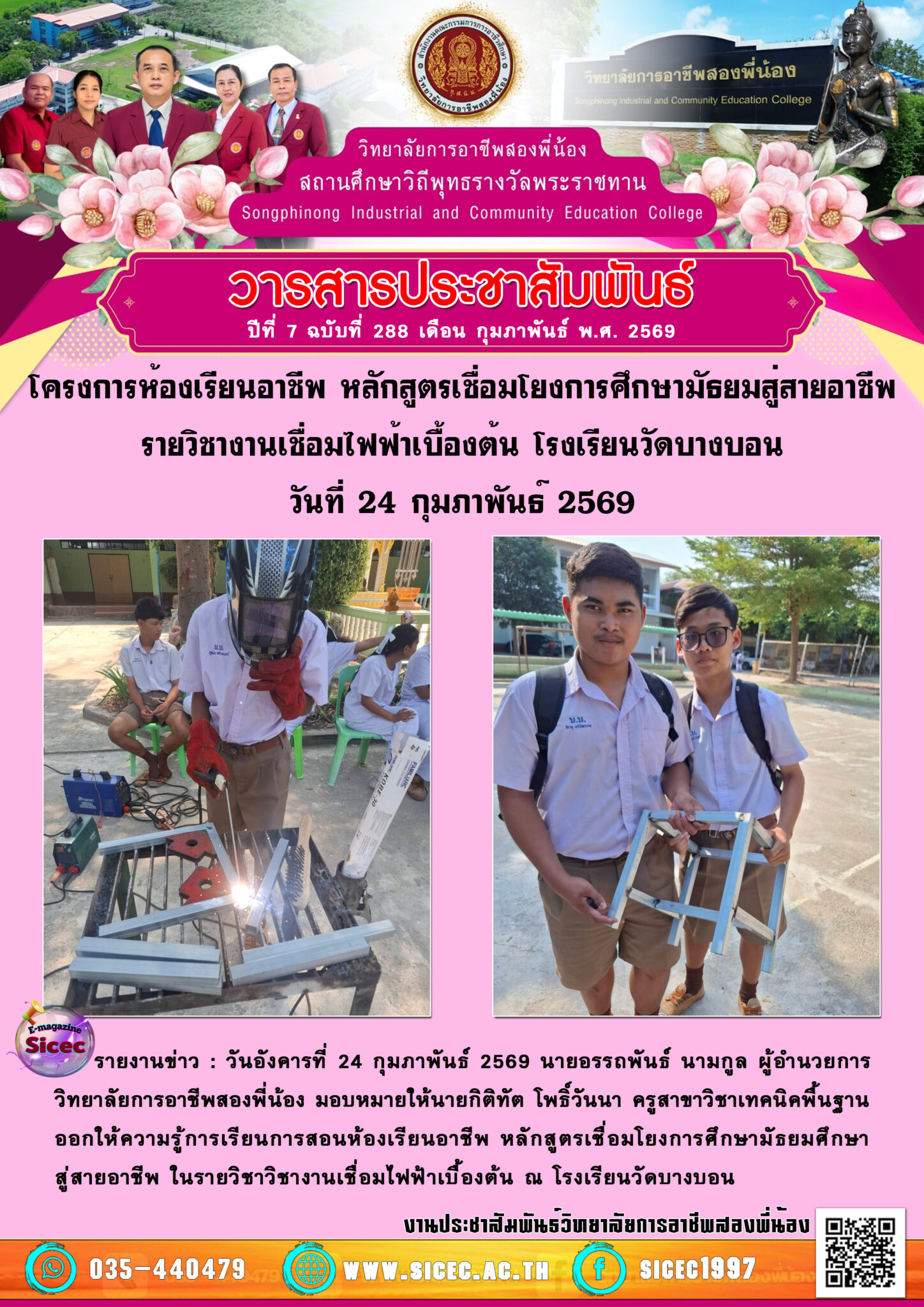 ฉบับที่ 288 โครงการห้องเรียนอาชีพ หลักสูตรเชื่อมโยงการศึกษามัธยมสู่สายอาชีพรายวิชางานเชื่อมไฟฟ้าเบื้องต้น โรงเรียนวัดบางบอน 26 กุมภาพันธ์ 256926 กุมภาพันธ์ 2026 นายอนุสรณ์ วงษ์ประเสริฐ จดหมายข่าว นายอนุสรณ์ วงษ์ประเสริฐ