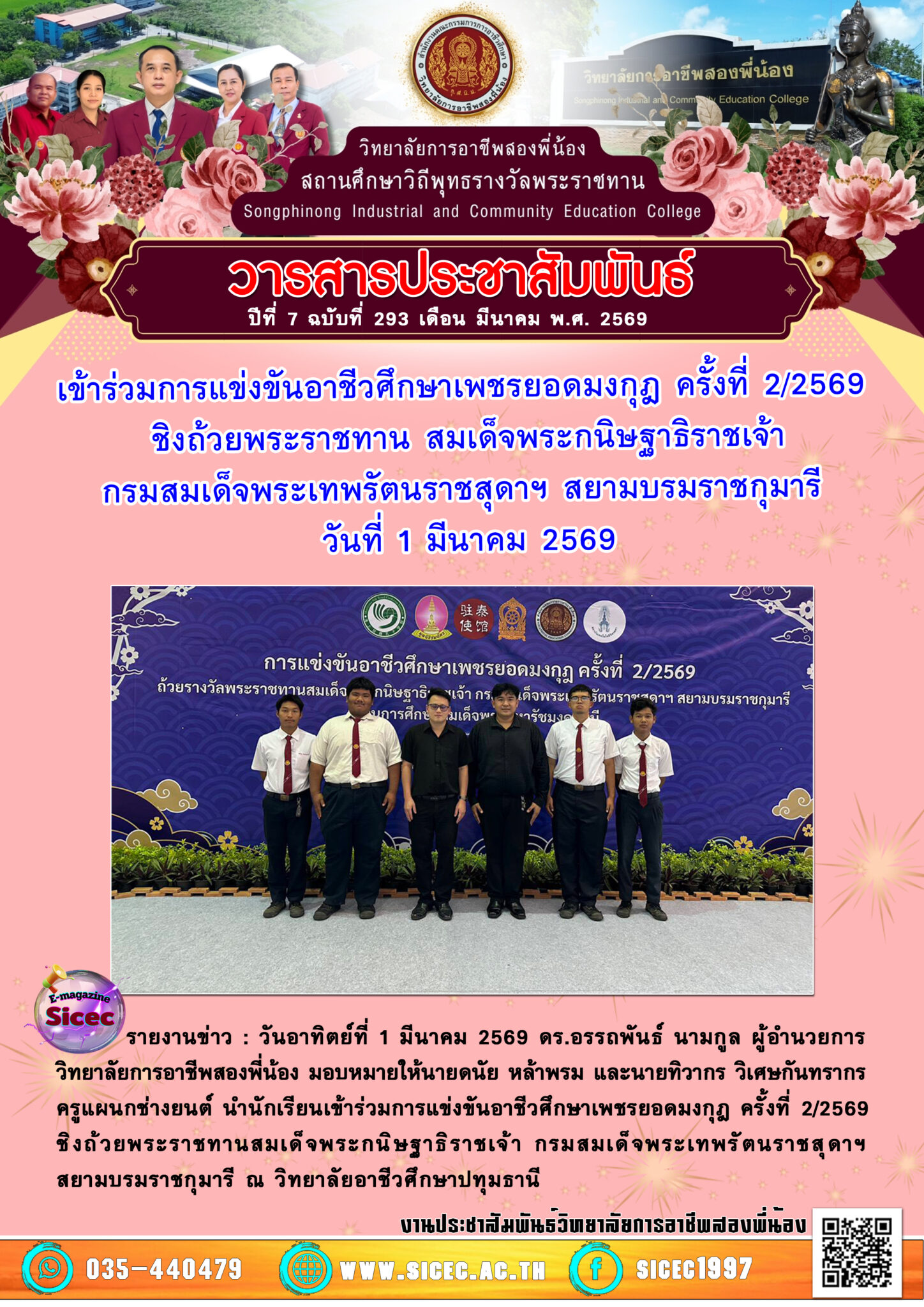 ฉบับที่ 293 เข้าร่วมการแข่งขันอาชีวศึกษาเพชรยอดมงกุฎ ครั้งที่ 2/2569ชิงถ้วยพระราชทาน สมเด็จพระกนิษฐาธิราชเจ้ากรมสมเด็จพระเทพรัตนราชสุดาฯ สยามบรมราชกุมารี 2 มีนาคม 25692 มีนาคม 2026 นายอนุสรณ์ วงษ์ประเสริฐ จดหมายข่าว นายอนุสรณ์ วงษ์ประเสริฐ