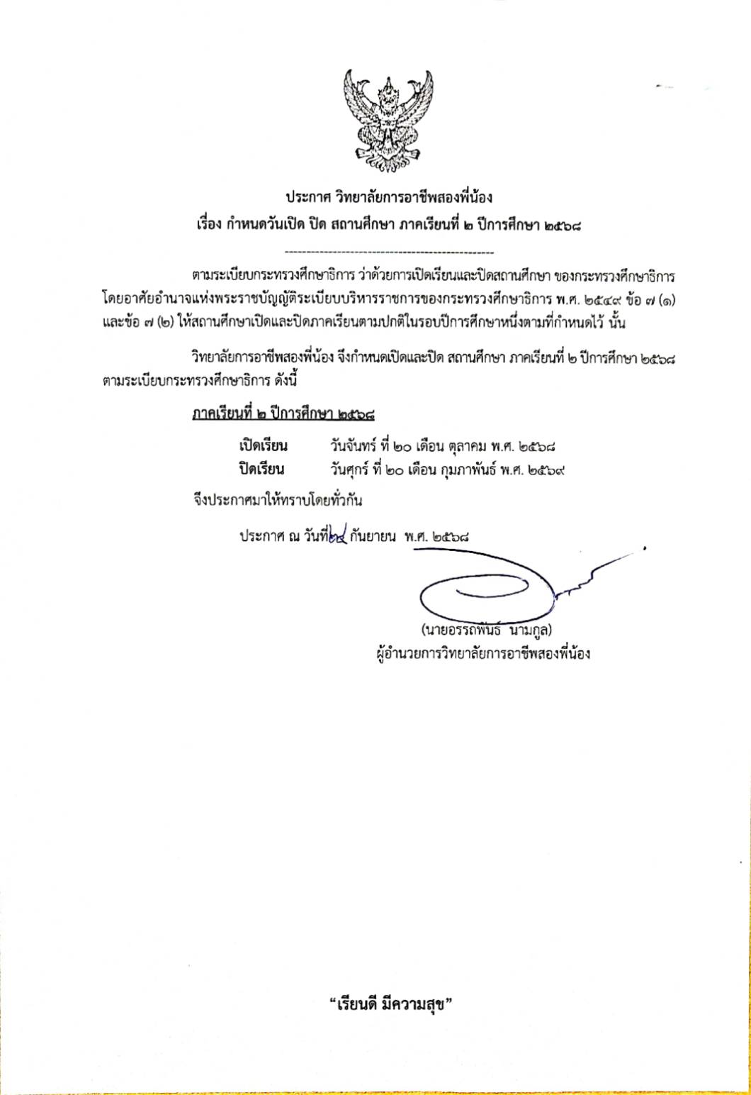 ประกาศวิทยาลัยการอาชีพสองพี่น้อง เรื่อง กำหนดวันเปิด ปิด สถานศึกษา ภาคเรียนที่ 2 ปีการศึกษา 2568 26 กันยายน 2568 นายอนุสรณ์ วงษ์ประเสริฐ ประกาศข่าวสาร นายอนุสรณ์ วงษ์ประเสริฐ