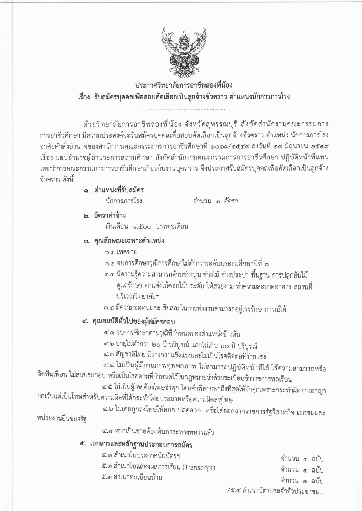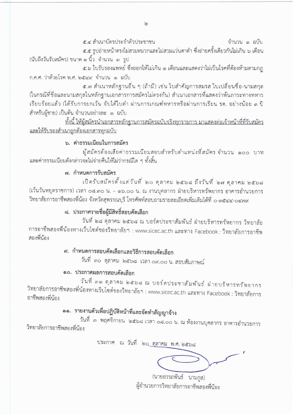 ประกาศวิทยาลัยการอาชีพสองพี่น้อง เรื่อง รับสมัครบุคคลเพื่อสอบคัดเลือกเป็นลูกจ้างชั่วคราว ตำแหน่งนักการภารโรง 20 ตุลาคม 2568 นายอนุสรณ์ วงษ์ประเสริฐ ประกาศข่าวสาร นายอนุสรณ์ วงษ์ประเสริฐ