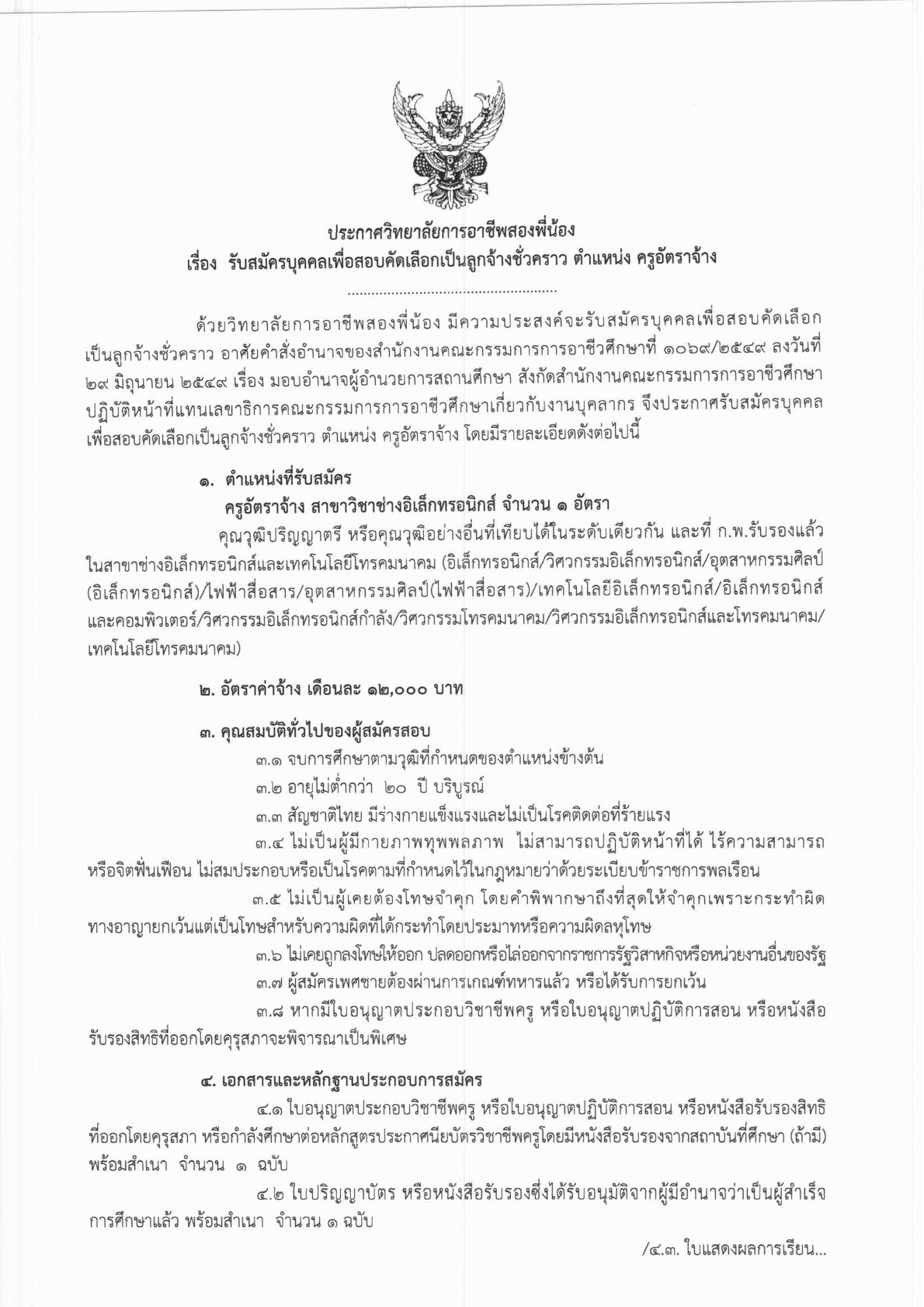 ประกาศวิทยาลัยการอาชีพสองพี่น้อง เรื่อง รับสมัครบุคคลเพื่อสอบคัดเลือกเป็นลูกจ้างชั่วคราว ตำแหน่งครูอัตราจ้าง สาขาวิชาช่างอิเล็กทรอนิกส์ 18 พฤศจิกายน 2568 นายอนุสรณ์ วงษ์ประเสริฐ ประกาศข่าวสาร นายอนุสรณ์ วงษ์ประเสริฐ