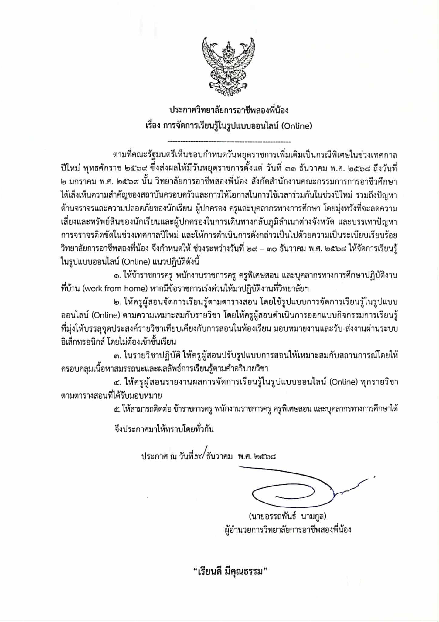 ประกาศวิทยาลัยการอาชีพสองพี่น้องเรื่อง การจัดการเรียนรู้ในรูปแบบออนไลน์(Online) ระหว่างวันที่ 29-30 ธันวาคม 2568 17 ธันวาคม 256817 ธันวาคม 2025 นายอนุสรณ์ วงษ์ประเสริฐ ประกาศข่าวสาร นายอนุสรณ์ วงษ์ประเสริฐ