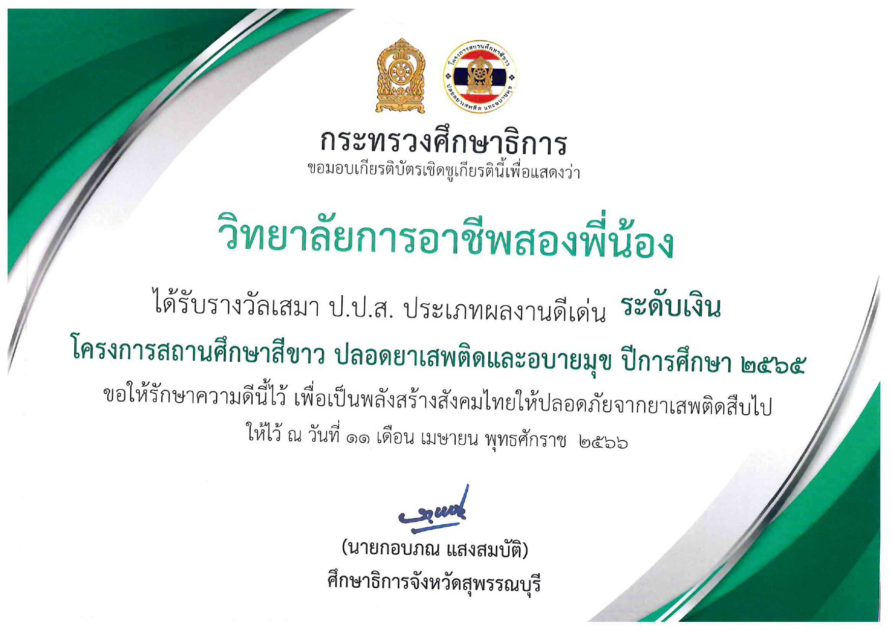 รางวัลสถานศึกษาสีขาว ป.ป.ส. ระดับเงิน