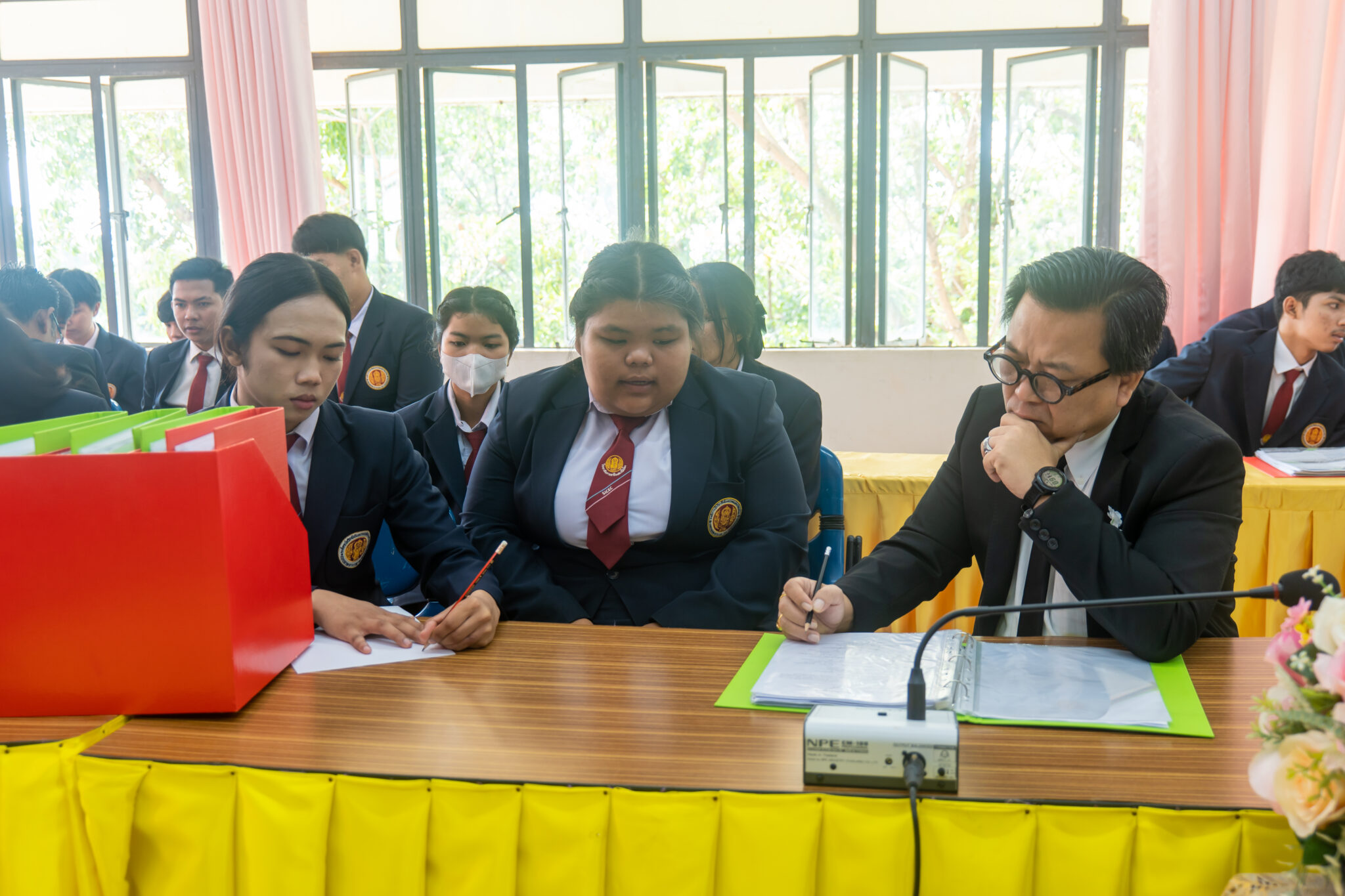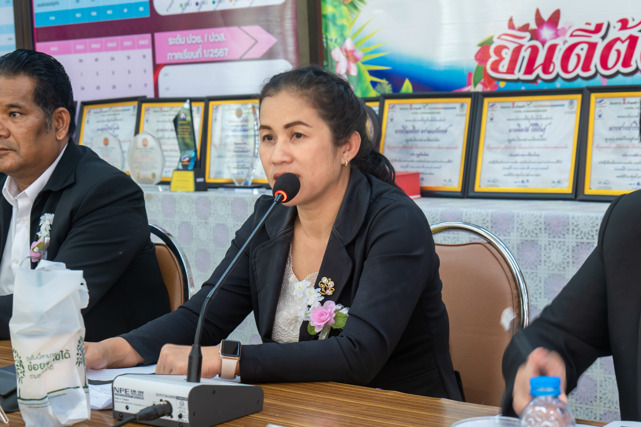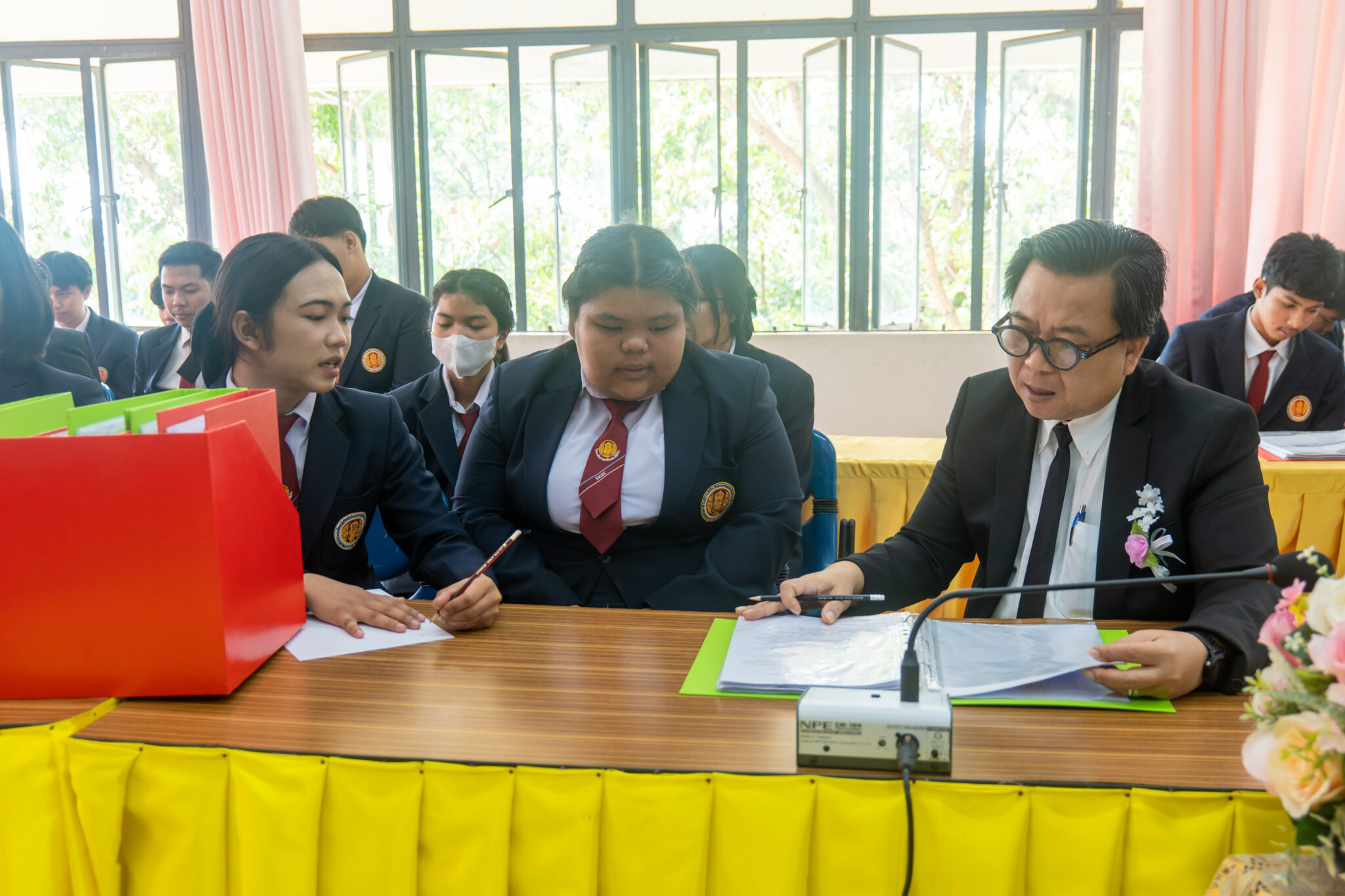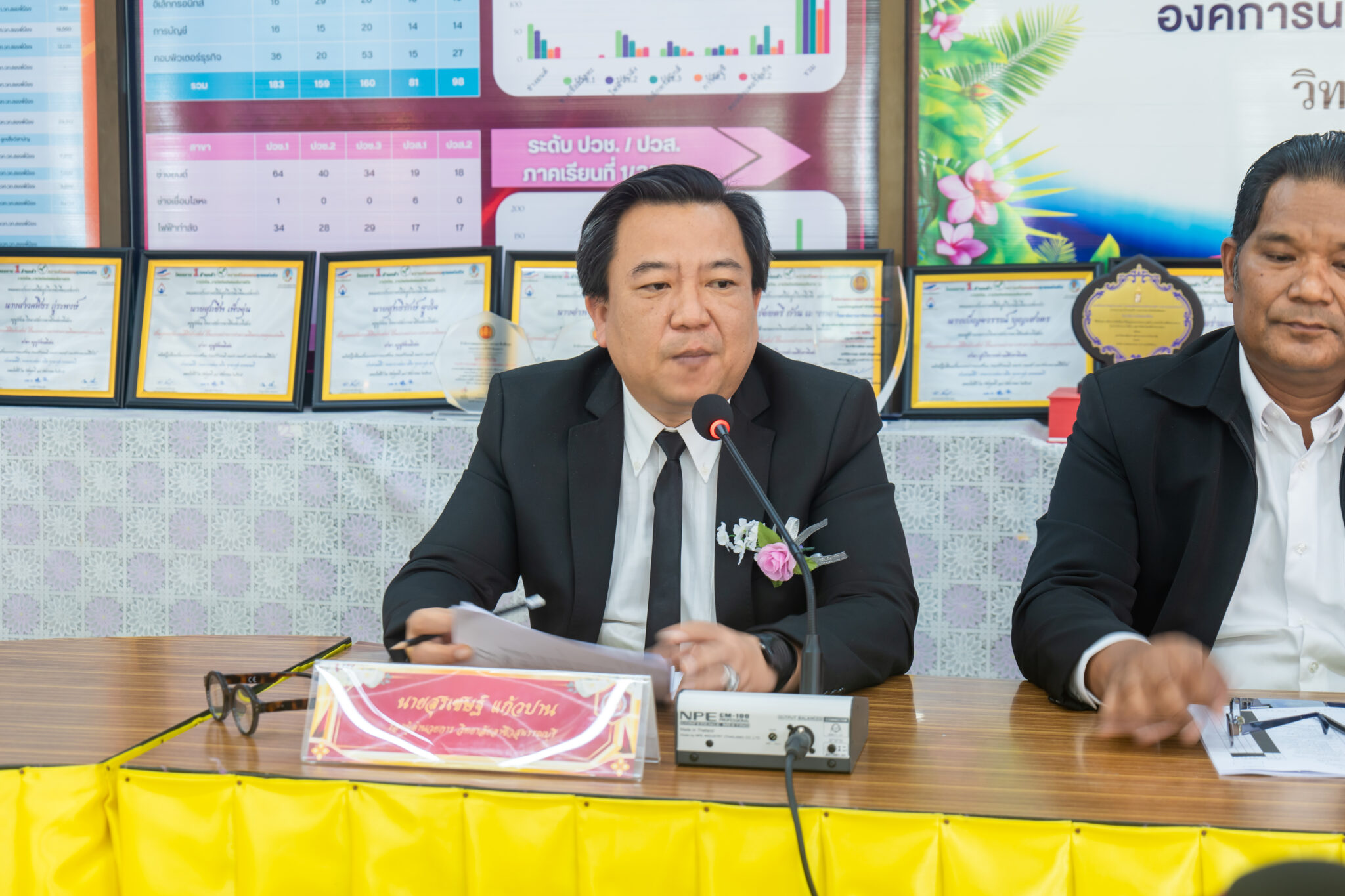 และนายนพดล ขุนวังห์ ครู ทำหน้าที่รองผู้อำนวยการ ได้ร่วมกันให้การต้อนรับคณะกรรมการประเมิน